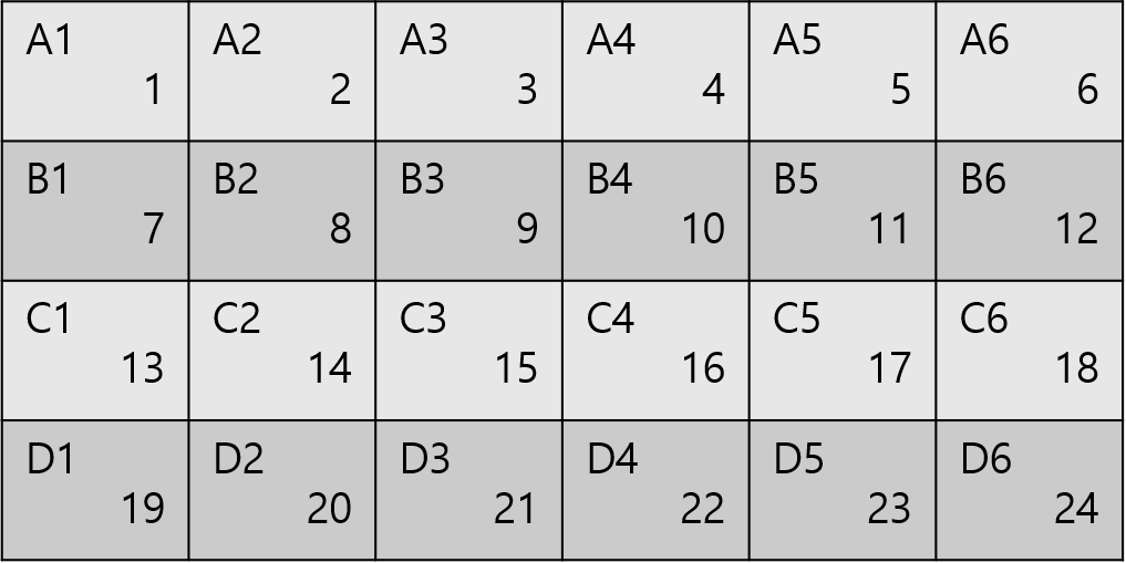좌석의 번호는 좌상단 끝에 있는 A열의 첫 번째 자리부터 1번으로 시작하여 오른쪽으로 번호가 하나씩 증가하다가 끝에 다다르면 B열의 첫 번째 자리부터 또 오른쪽으로, C열의 첫 번째 자리부터 또 오른쪽으로 진행하는 것을 반복하면서 숫자가 증가해 나간다.