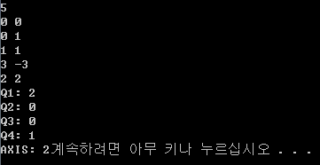 각 사분면과 축에 점이 몇 개 있는지를 예제 출력과 같은 형식으로 출력한다.