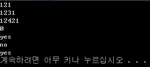 각 줄마다 주어진 수가 팰린드롬수면 'yes', 아니면 'no'를 출력한다.