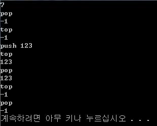 - top: 스택의 가장 위에 있는 정수를 출력한다. 만약 스택에 들어있는 정수가 없는 경우에는 -1을 출력한다.