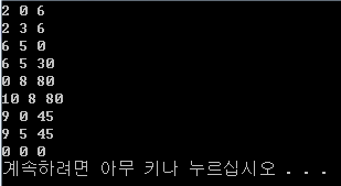 Input is a series of lines, each containing 3 integers, l, w, and a ( 0 ≤ l w ≤100, 0 ≤ a ≤ 10,000) representing the length, width and area of a rectangle in that order. The integers are separated by a single space. In each row, only one of the values has been replaced by a zero. The final row contains 0 0 0 and should not be processed.