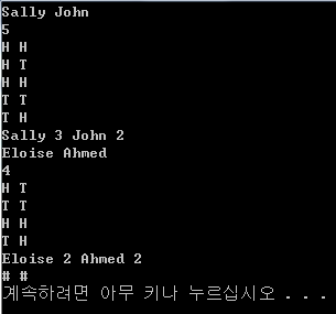 Input for this problem will consist of a number of games. Each game will begin with a line containing 2 names of no more than 20 letters each and separated by a space. The second line of each game will contain a single positive integer, n, specifying the number of recorded coin tosses (0 < n <= 1000). n coin tosses follow, each on a single lines containing 2 characters (either 'H' or 'T' – "heads" or "tails"), separated by a space. The first character denotes the call and the second denotes the result. Input will be terminated by a line containing just # #.
