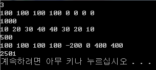 다음 T 행에 걸쳐 각각 8개의 정수가 주어진다. 처음 네 개의 정수는 각각 캐릭터의 기본 HP, MP, 공격력, 방어력이다. 이 값들은 1 이상 999 이하로 주어진다. 다음 네 개의 정수는 각각 캐릭터의 장비에 의해 증감되는 HP, MP, 공격력, 방어력이다. 이 값들은 -999 이상 999 이하로 주어진다.