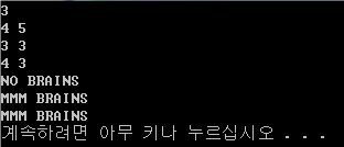 For each data set, there will be exactly one line of output. This line will be "MMM BRAINS" if the number of brains the zombie eats is greater than or equal to the number of brains the zombie requires to stay alive. Otherwise, the line will be "NO BRAINS".