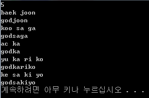 첫 번째 줄에는 닉네임의 수 N(1 ≤ N ≤ 100)이 주어진다. 두 번째 줄부터 N개의 줄에는 음절 단위로 쪼갠 닉네임이 주어진다. 각 줄은 알파벳 소문자와 공백만으로 이루어지며, 쪼갠 닉네임의 총 길이(공백 포함)는 100을 넘지 않는다. 쪼갠 닉네임에는 1개 이상의 공백이 존재한다.