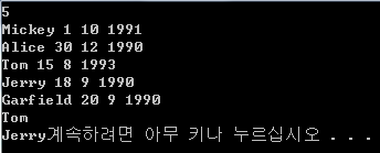 다음 n개 줄에는 각 학생의 이름과 생일이 "이름 dd mm yyyy"와 같은 형식으로 주어진다. 이름은 그 학생의 이름이며, 최대 15글자로 이루어져 있다. dd mm yyyy는 생일 일, 월, 연도이다. (1990 ≤ yyyy ≤ 2010, 1 ≤ mm ≤ 12, 1 ≤ dd ≤ 31) 주어지는 생일은 올바른 날짜이며, 연, 월 일은 0으로 시작하지 않는다.