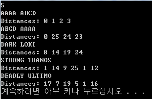 각 테스트 케이스 마다 각 글자의 알파벳 거리를 공백으로 구분해 출력한다.