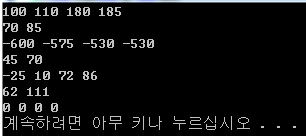 테스트 케이스는 여러줄에 걸쳐 입력된다. 각 테스트 케이스는 4개의 정수 a, b, c, d (-5000 ≤ a ≤ b ≤ c ≤ d ≤ 2000)로 이뤄진다. [a, b]는 출생일의 범위, [c, d]는 사망일의 범위이다. a, b, c, d의 입력이 모두 0일 경우 프로그램을 종료한다.
