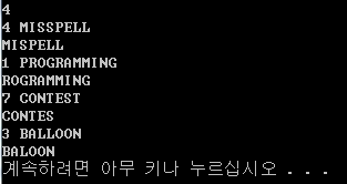 첫째 줄에 테스트 케이스의 개수 T(1<=T<=1,000)가 주어진다. 각 테스트 케이스는 한 줄로 구성되어 있다. 첫 숫자는 창영이가 오타를 낸 위치이고, 두 번째 문자열은 창영이가 친 문자열이다. 문자열의 가장 첫 문자는 1번째 문자이고, 문자열의 길이는 80을 넘지 않고, 대문자로만 이루어져 있다. 오타를 낸 위치는 문자열 길이보다 작거나 같다.