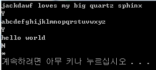 각 테스트 케이스에 대해서, 입력으로 주어진 문장이 팬그램이라면 'Y', 아니라면 'N'를 출력한다.