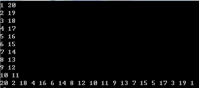 오름차순으로 한 줄로 놓여있는 20장의 카드에 대해 10개의 구간이 주어지면, 주어진 구간의 순서대로 위의 규칙에 따라 순서를 뒤집는 작업을 연속해서 처리한 뒤 마지막 카드들의 배치를 구하는 프로그램을 작성하시오.