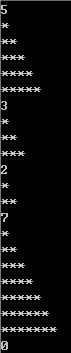 Each line of input contains a single positive integer, n, 1 <= n <= 100. The last line of input contains 0. For each non-zero number, draw a triangle of that size.
