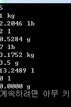 각 테스트 케이스에 대해서 바꾼 값과 단위를 출력한다. 값은 반올림해서 소수점 4째자리까지 출력한다. 단위는 kg, lb, l, g중 하나이며, 설명은 입력 설명에 있다.
