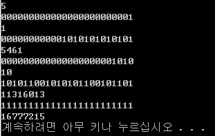The first line of input gives n ≤ 1000, the number of test cases. Then follow n lines with positive numbers represented as 24-bit binary strings (0s and 1s).