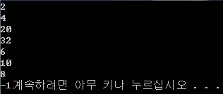 홀수가 존재하지 않는 경우에는 첫째 줄에 -1을 출력한다. 홀수가 존재하는 경우 첫째 줄에 홀수들의 합을 출력하고, 둘째 줄에 홀수들 중 최솟값을 출력한다.