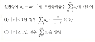 - 일반항이 an = a * r^(n-1)인 무한등비수열 → 급수의 수렴과 발산 판단 O