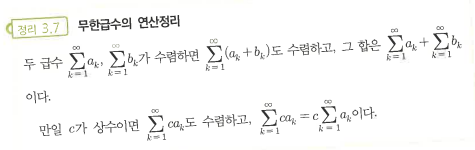 - 두 급수 ak, bk가 수렴하면 (ak+bk)도 수렴, 그 합은 ak + bk