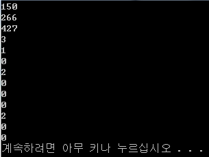 예를 들어 A = 150, B = 266, C = 427 이라면 A × B × C = 150 × 266 × 427 = 17037300 이 되고, 계산한 결과 17037300 에는 0이 3번, 1이 1번, 3이 2번, 7이 2번 쓰였다.