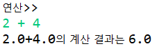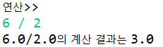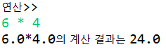 사칙 연산을 입력받아 계산하는 프로그램을 작성하고자 한다. 연산자는 +, -, *, /의 네 가지로 하고 피연산자는 모두 실수로 한다. 피연산자와 연산자는 실행 사례와 같이 빈 칸으로 분리하여 입력한다. 0으로 나누기 시 "0으로 나눌 수 없습니다."를 출력하고 종료한다.
