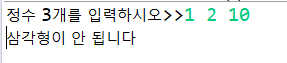 Scanner를 이용하여 삼각형의 변의 길이를 나타내는 정수를 3개 입력받고 이 3개의 수로 삼각형을 만들 수 있는지 판별하라. 삼각형이 되려면 두 변의 합이 다른 한 변의 합보다 커야 한다.