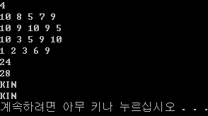 각 테스트 케이스에 대해서 총점을 한 줄씩 출력한다. 만일 점수 조정을 거쳐서 다시 점수를 매기려고 하는 경우에는 총점 대신 KIN을 출력한다.