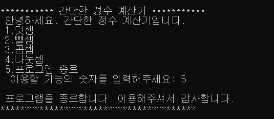 계산기를 이용하기 전, 프로그램은 사용자에게 이용할 기능을 입력받는다. 특정 숫자에 따라 사칙연산 또는 프로그램 종료가 이루어진다. 만약 이 중에 없는 숫자를 입력받을 경우, 잘못된 입력을 받았다고 알려준 후, 다시 입력받게 만든다.