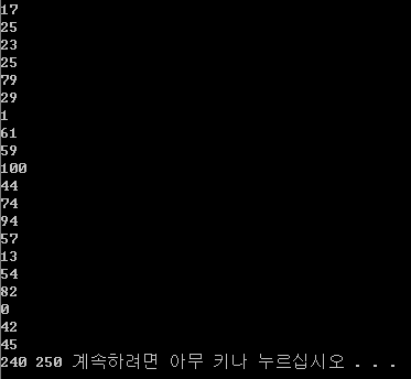 입력은 20 행으로 구성된다. 1 번째 줄부터 10 번째 줄에는 W 대학의 각 참가자의 점수를 나타내는 정수가 11 번째 줄부터 20 번째 줄에는 K 대학의 각 참가자의 점수를 나타내는 정수가 적혀있다. 이 정수는 모두 0 이상 100 이하이다.
