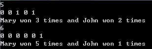 The input contains several test cases. The first line of a test case contains a single integer N indicating the number of games played (1 ≤ N ≤ 10000). The following line contains N integers Ri, separated by space, describing the list of results. If Ri = 0 it means Mary won the ith game, if Ri = 1 it means John won the ith game (1 ≤ i ≤ N). The end of input is indicated by N = 0.
