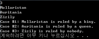 For each test case, output one line containing "Case #x: C is ruled by Y.", where x is the case number (starting from 1), C is the country name, and Y is either "a king", "a queen" or "nobody".