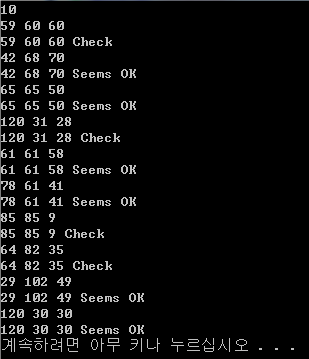 For each set of readings, output the numbers as input followed by the word Check if they do not add up to 180, or Seems OK if they do.