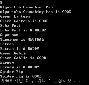 비키니시티에는 초능력을 가진 수퍼 히어로들로 바글바글하다. 스폰지밥과 패트릭은 주어진 문자열로 좋은놈과 나쁜놈을 골라내려 한다.