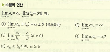 - an이 여러 개의 값에 가까워지지만 일정한 하나의 값에 수렴하지 않는 경우, "수열 {an}을 진동(oscillate)한다"