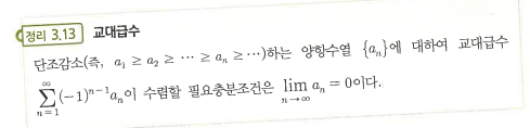 - 단조함수( a1 >= a2 >= a3 >= ... >= an >= ,,,)인 양항수열 {an}에 대해 교대급수가 수렴할 필요충분조건